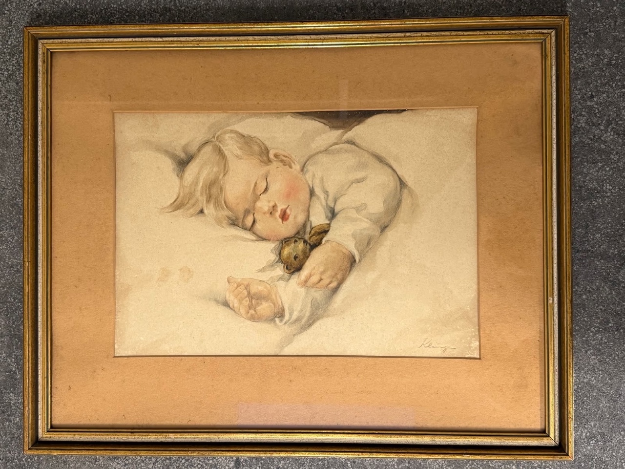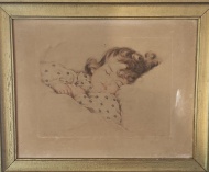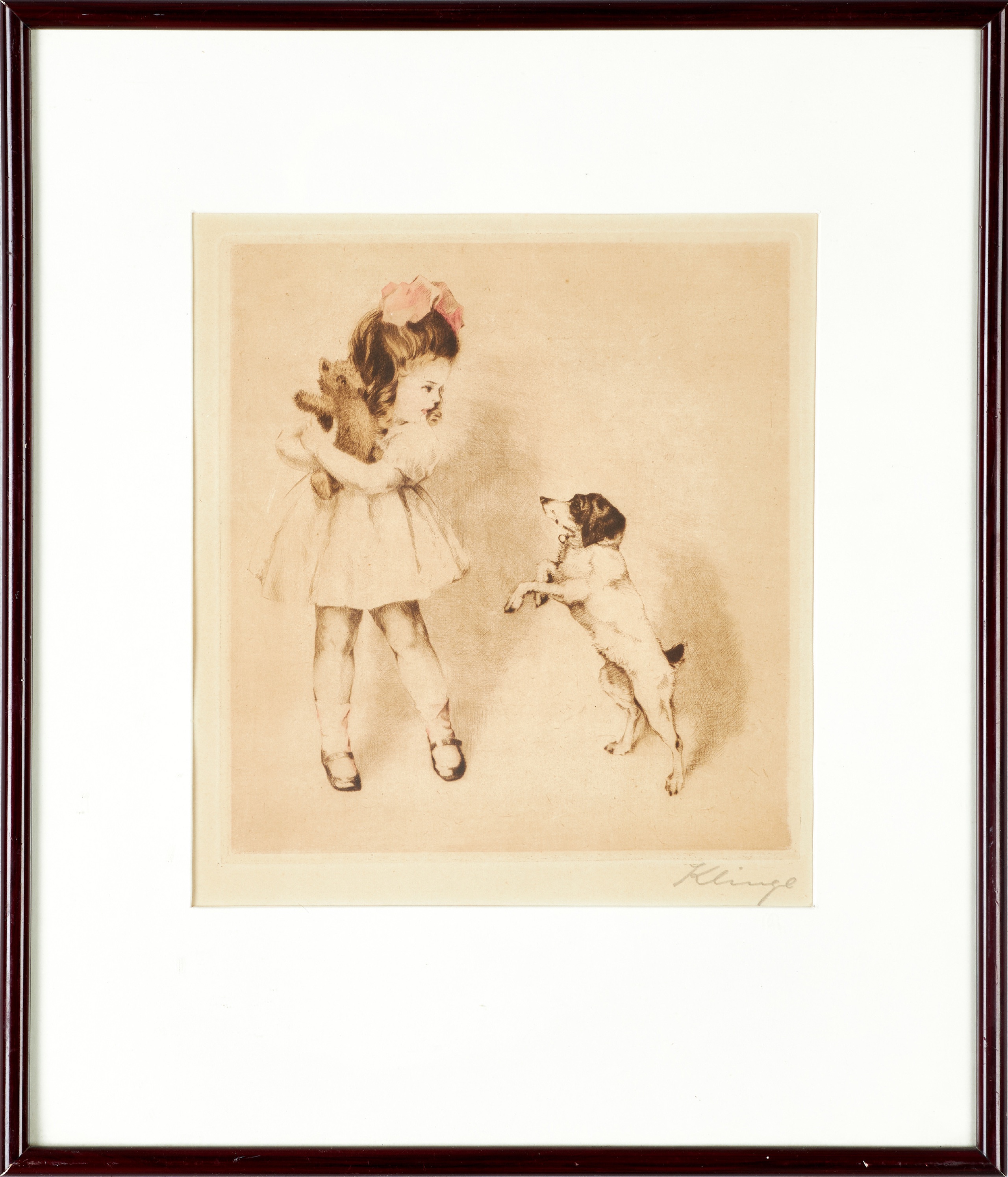 Short description: A etching of a small girl and a dog by Hedwig Klinge, wife of Fritz Neumann.